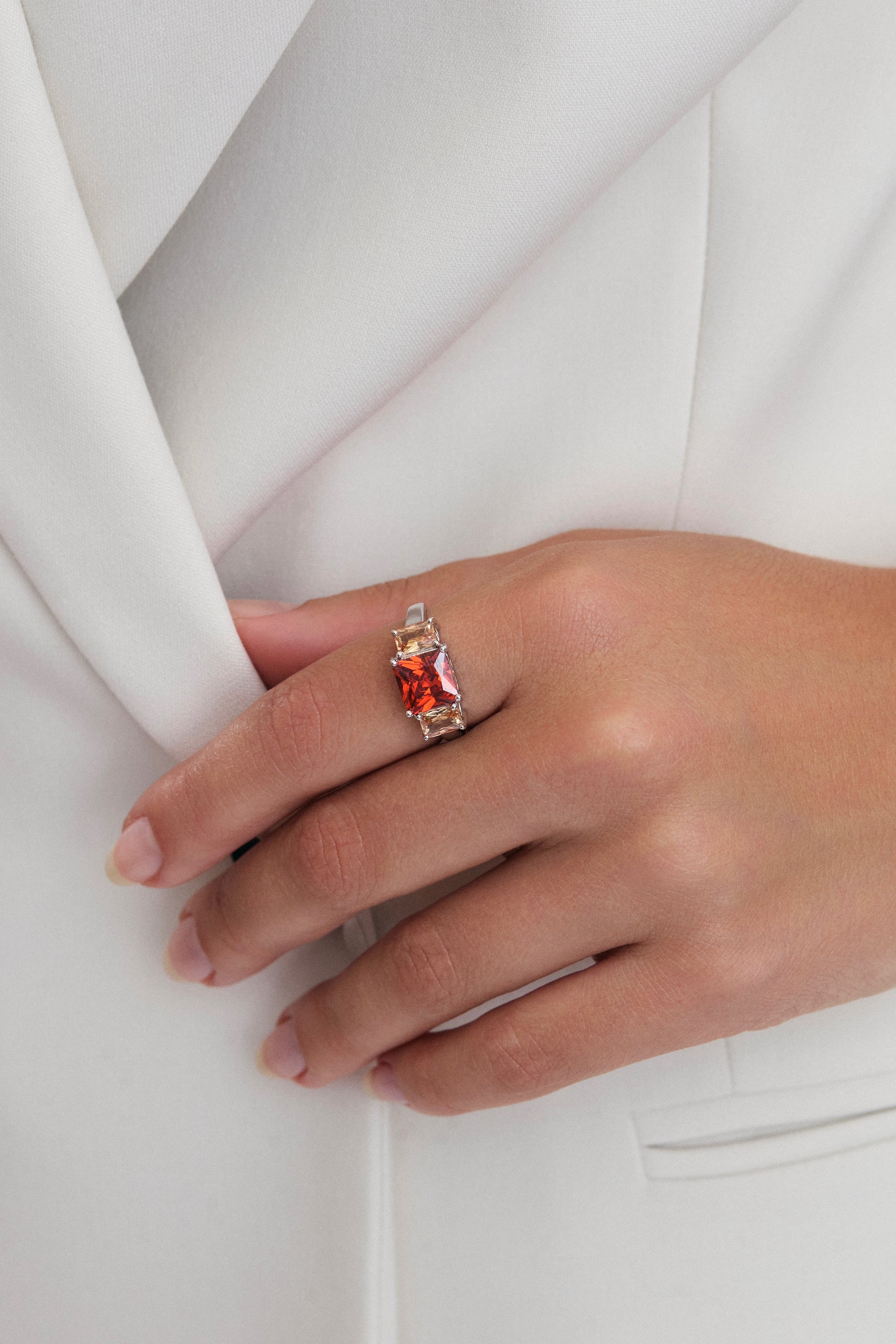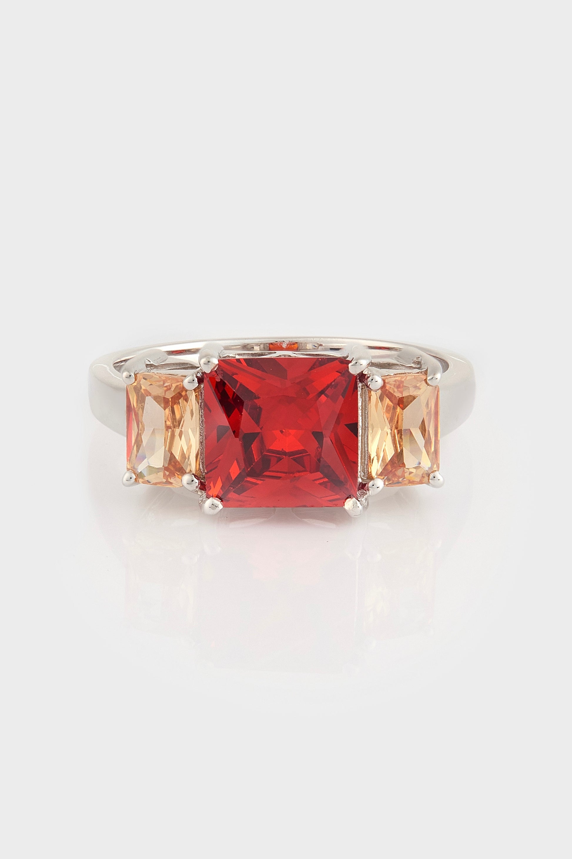 The L'amira Carats Inferno ring features a bold, 8x8mm baguette red zircon gemstone, renowned for its intense, vibrant hue and exceptional clarity. Flanking the central gemstone are two exquisite 6x4mm baguette champagne zircons, their soft, warm tones providing a perfect counterbalance to the vibrant red zircon.